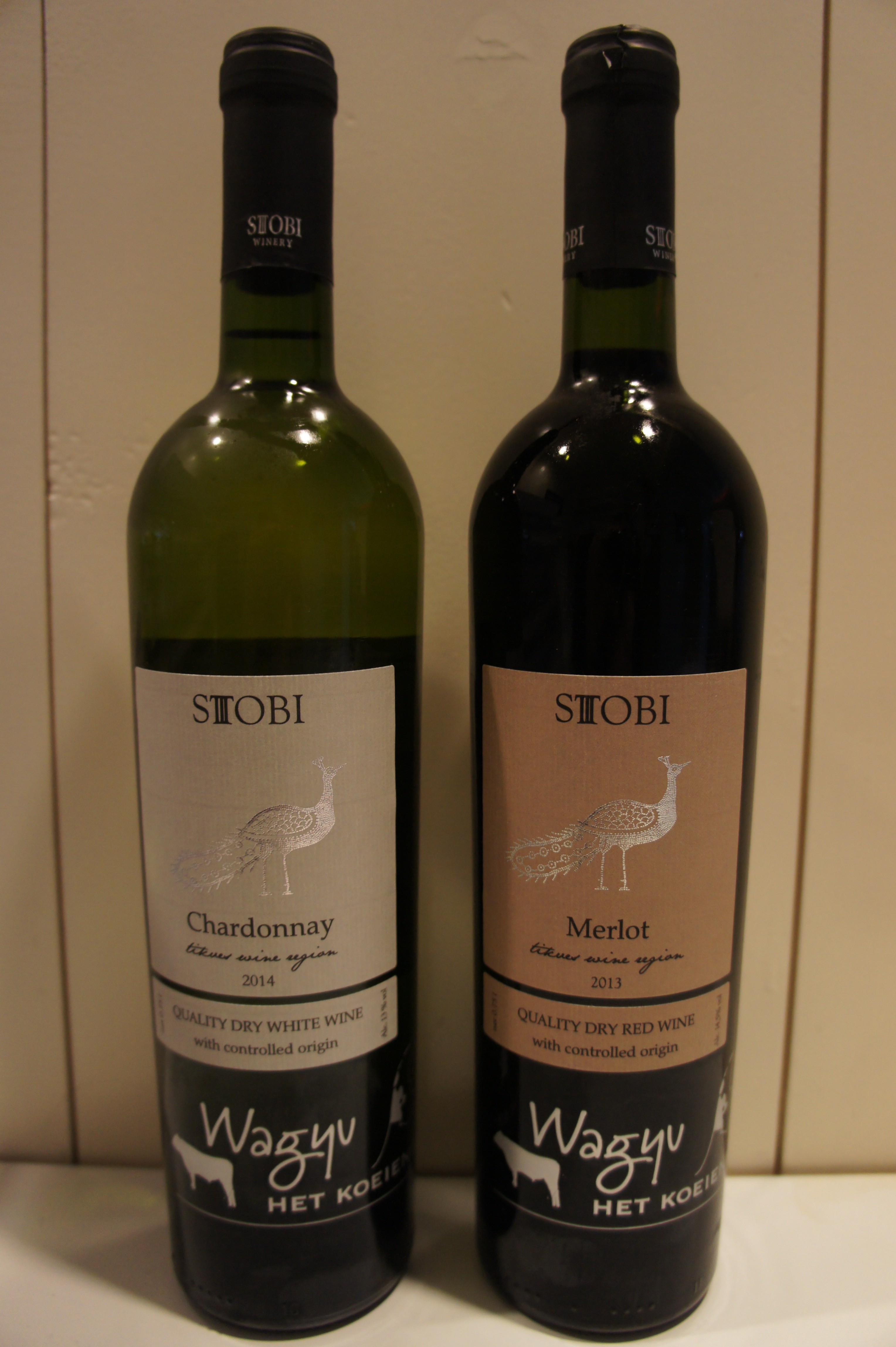 Fles rode wijn en fles witte wijn (apart verkrijgbaar) Prijs per fles € 7,95 Rode wijn: Stobi Merlot Witte wijn: Stobi Chardonnay