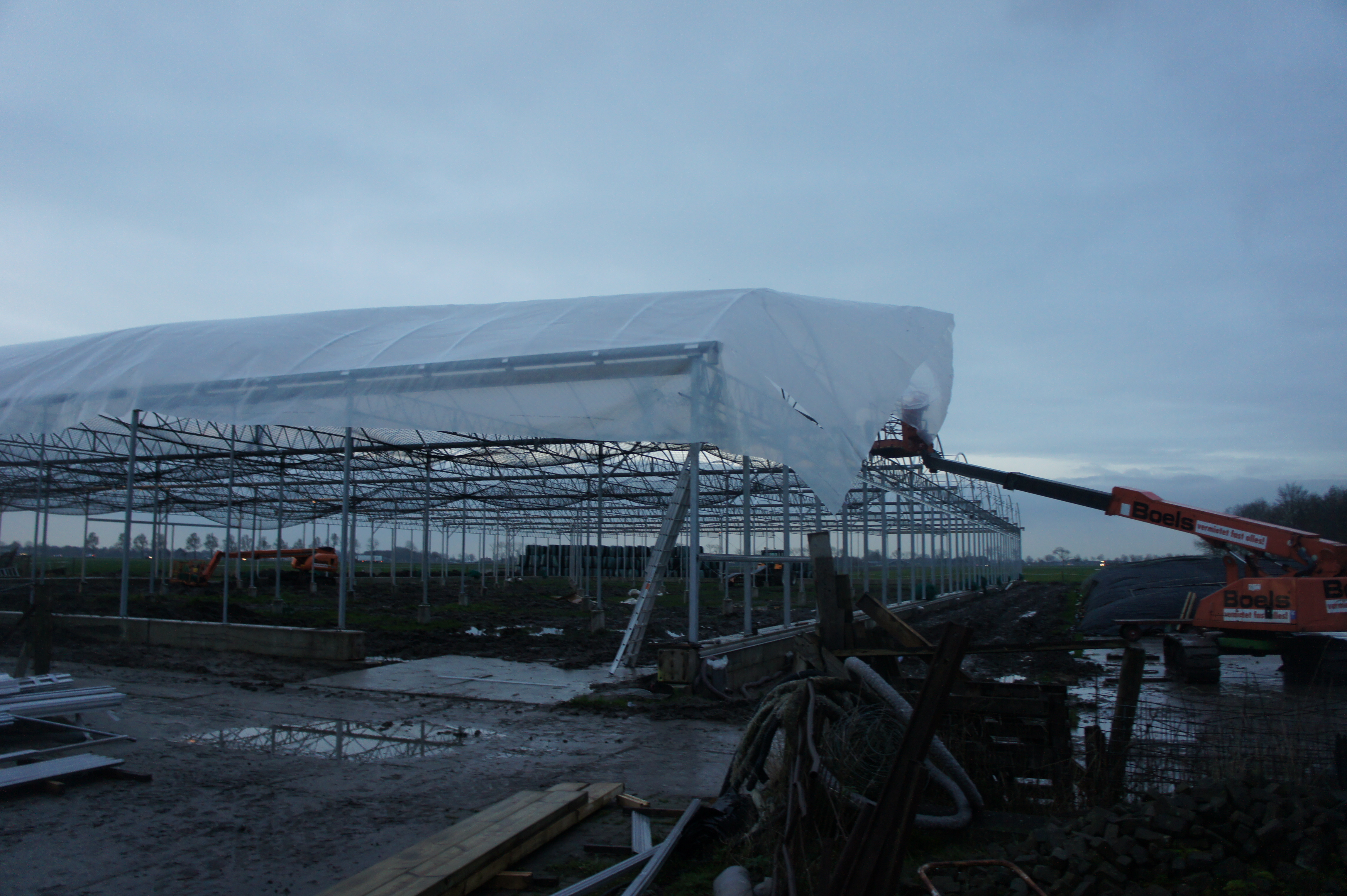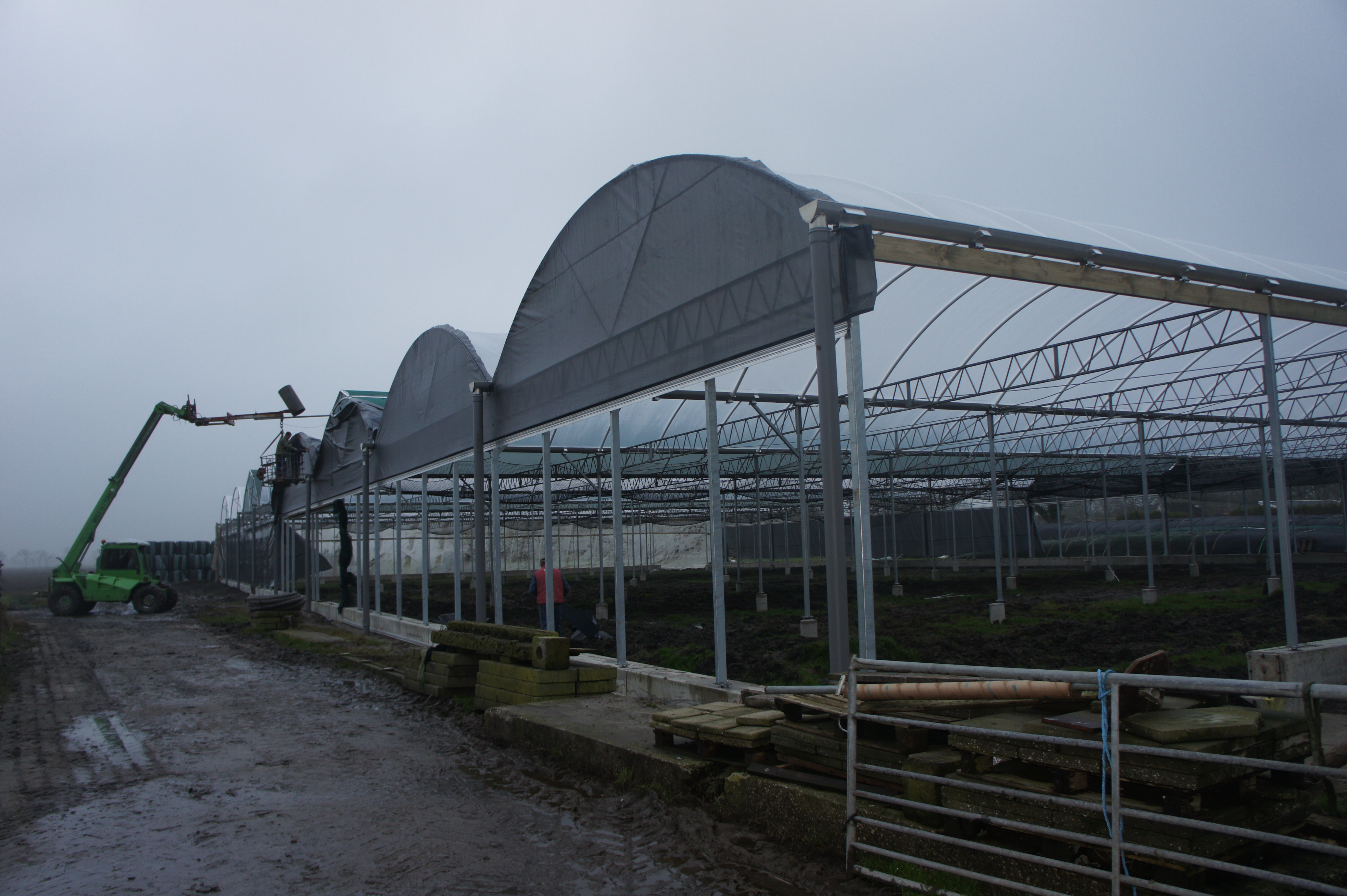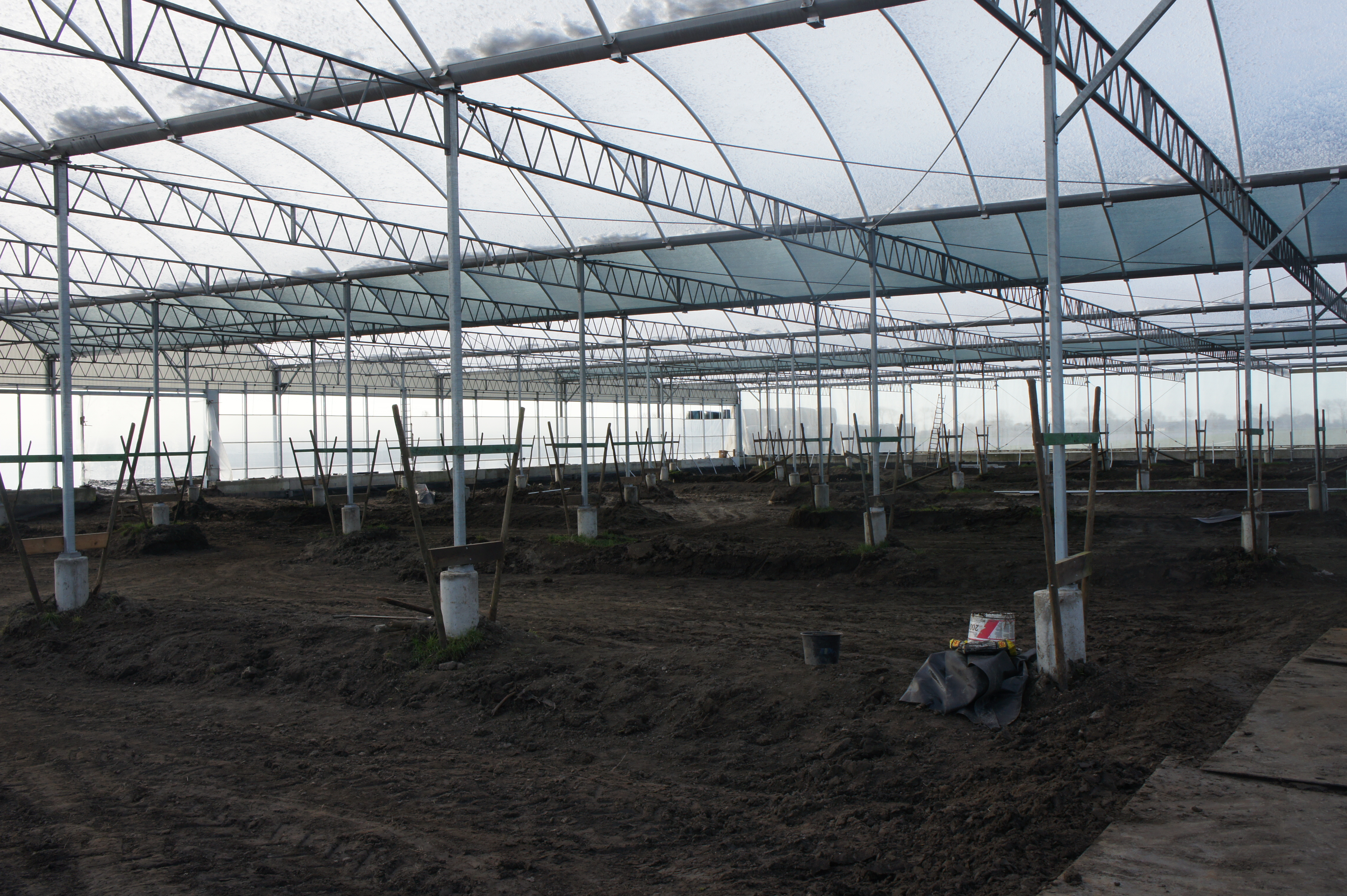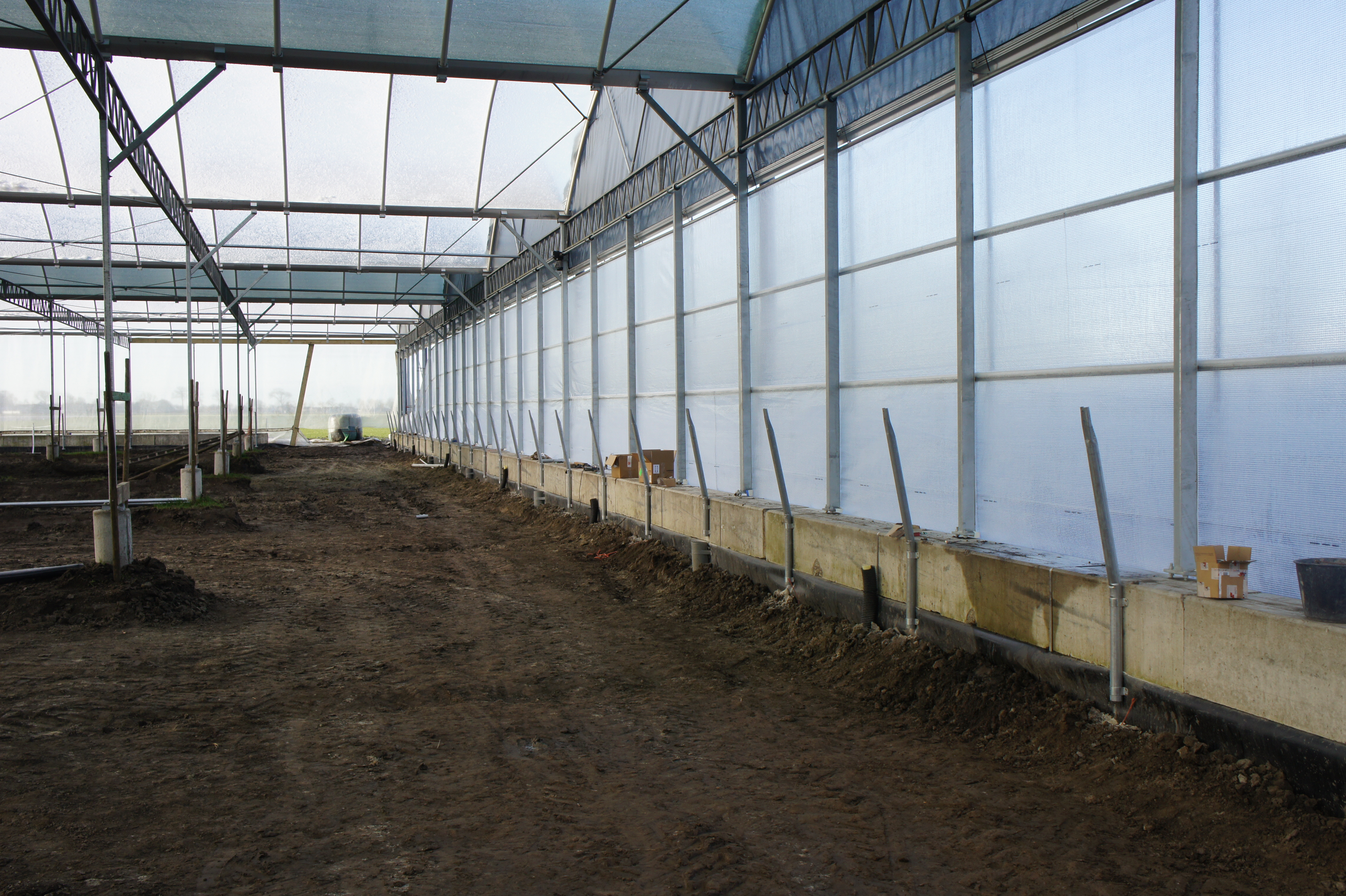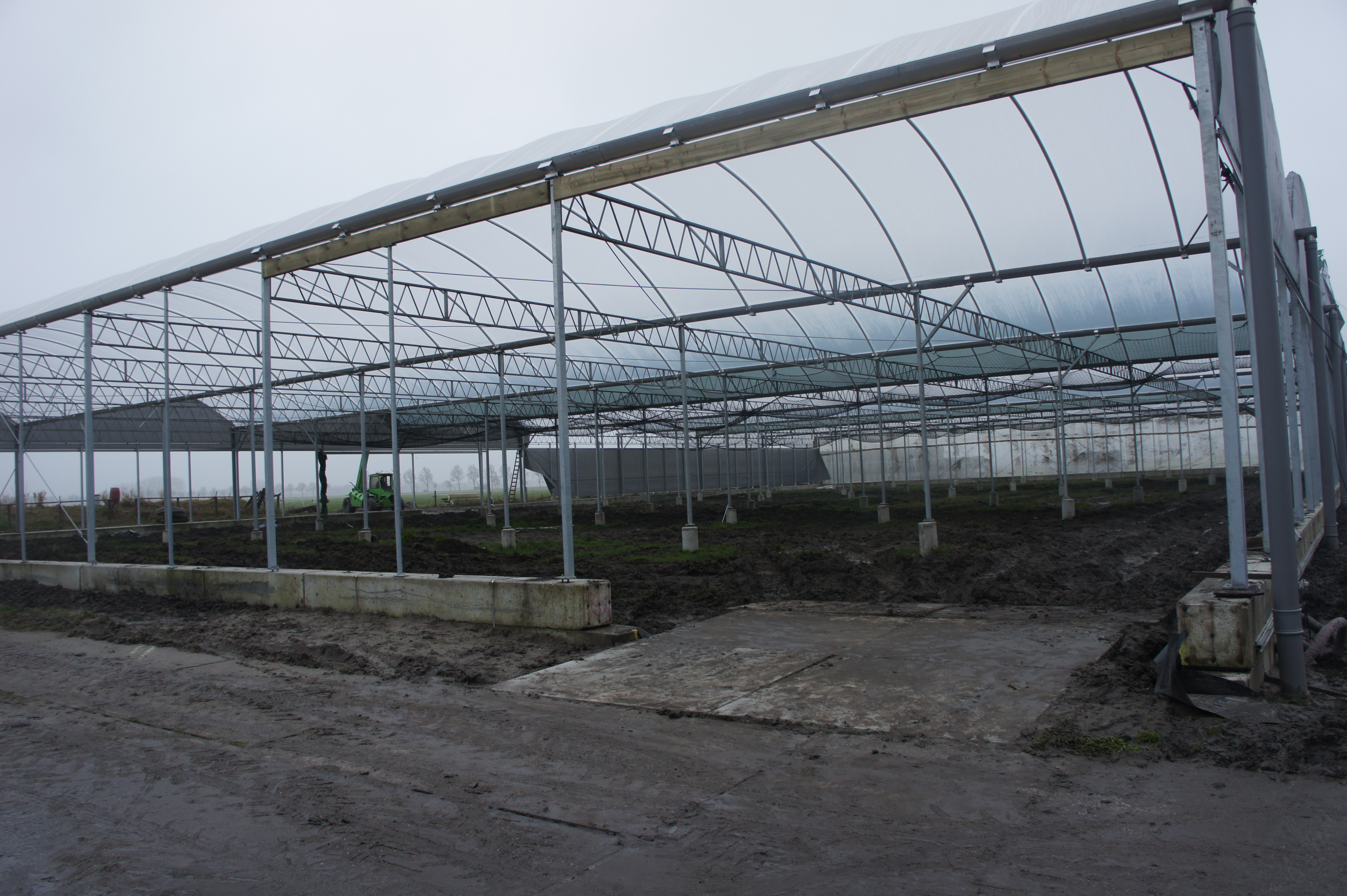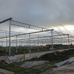 Om de kosten zo laag mogelijk te houden, bouwen we de stal zelf. De foto’s geven u een impressie over de bouwfases. Helaas heeft het weer de afgelopen maanden niet meegezeten; eerst vele mm regen, waardoor onze terrein op de plek van de stal een grote modderpoel leek. Door de kou en de wind kon het folie niet strak genoeg gespannen worden en de storm eind januari zorgde voor veel stormschade aan onze stal in opbouw. Ondanks de tegenslagen vordert de bouw gestaag.
