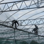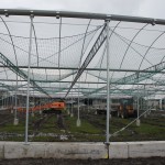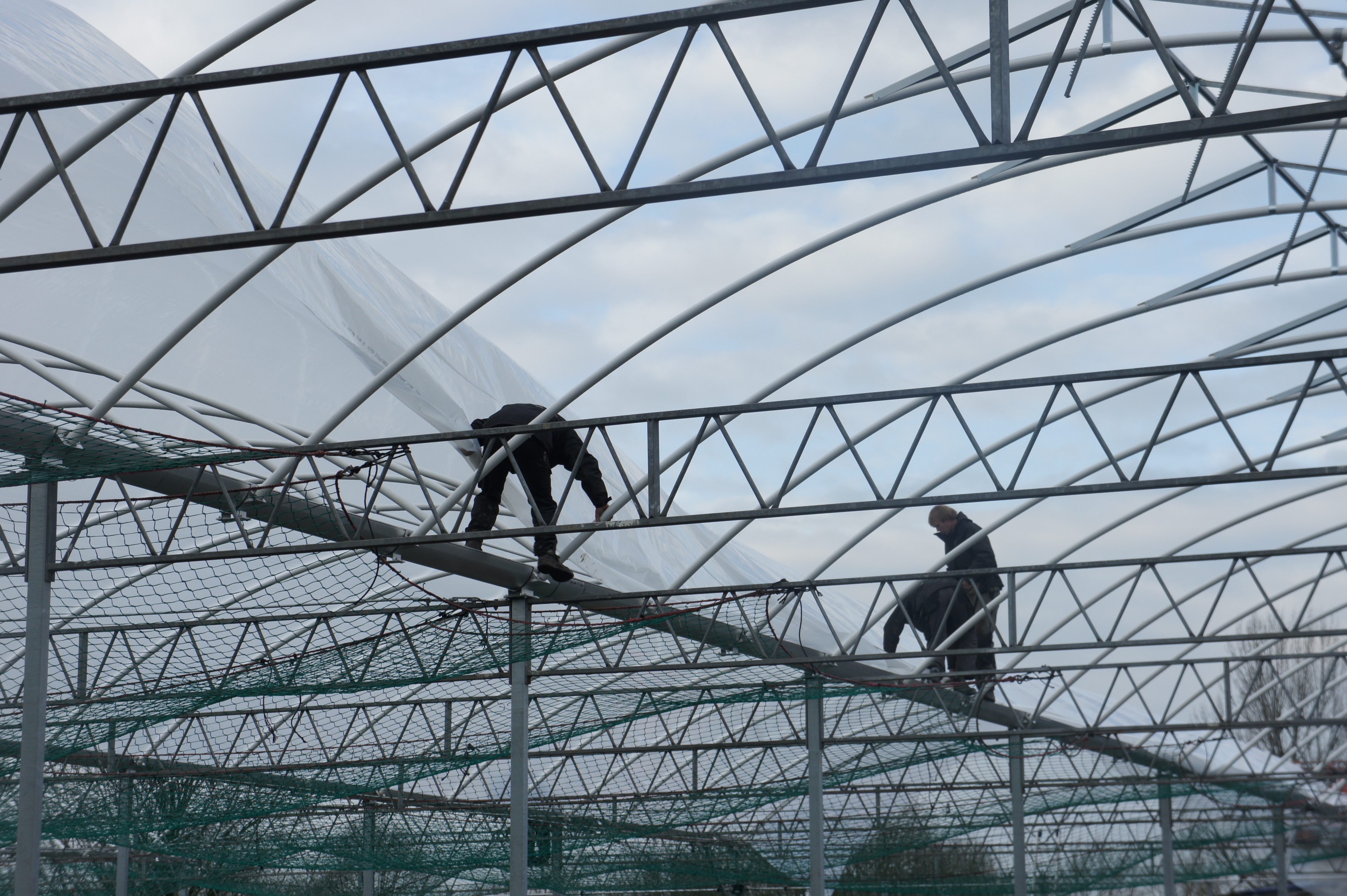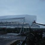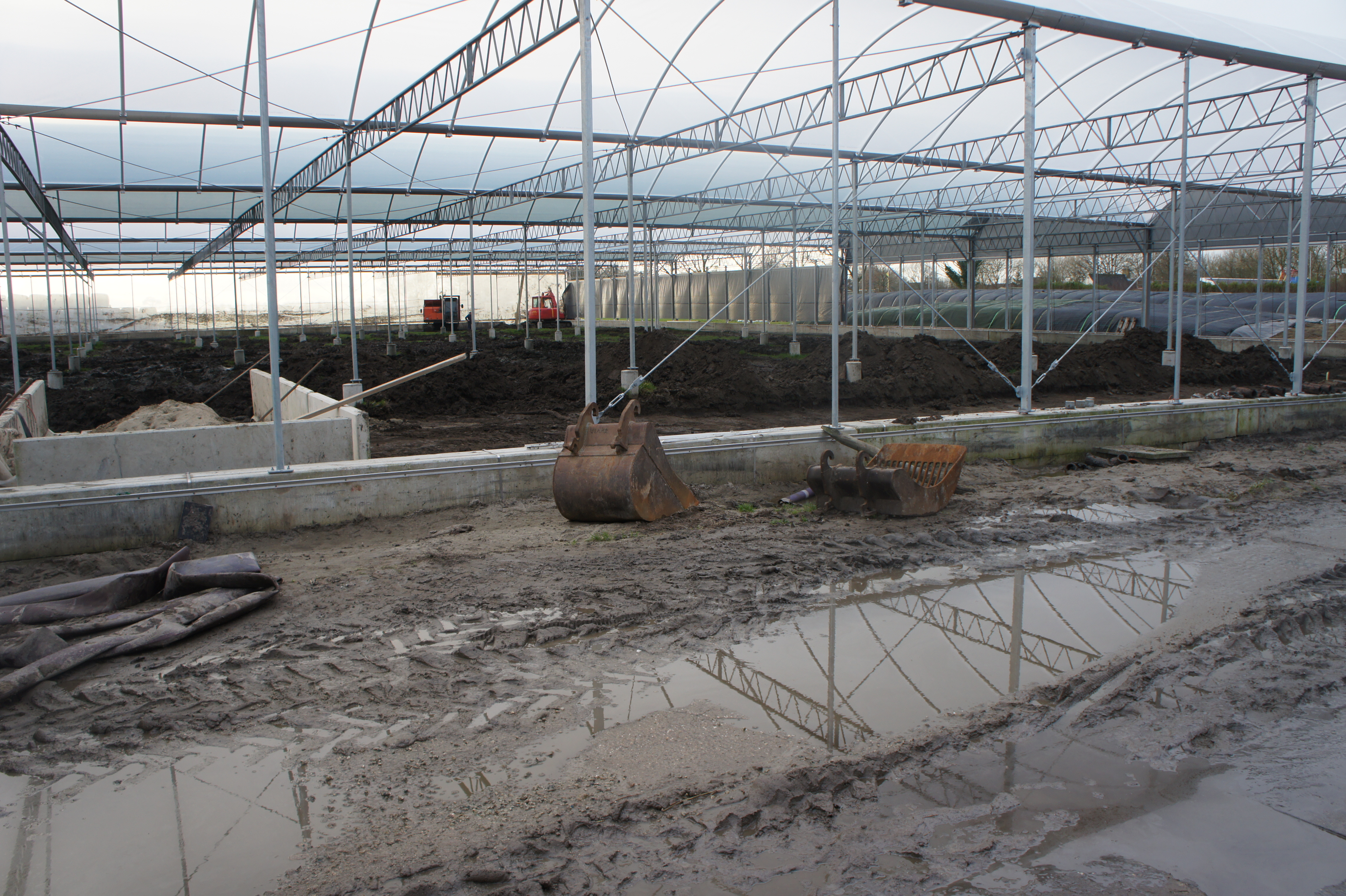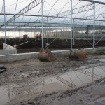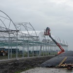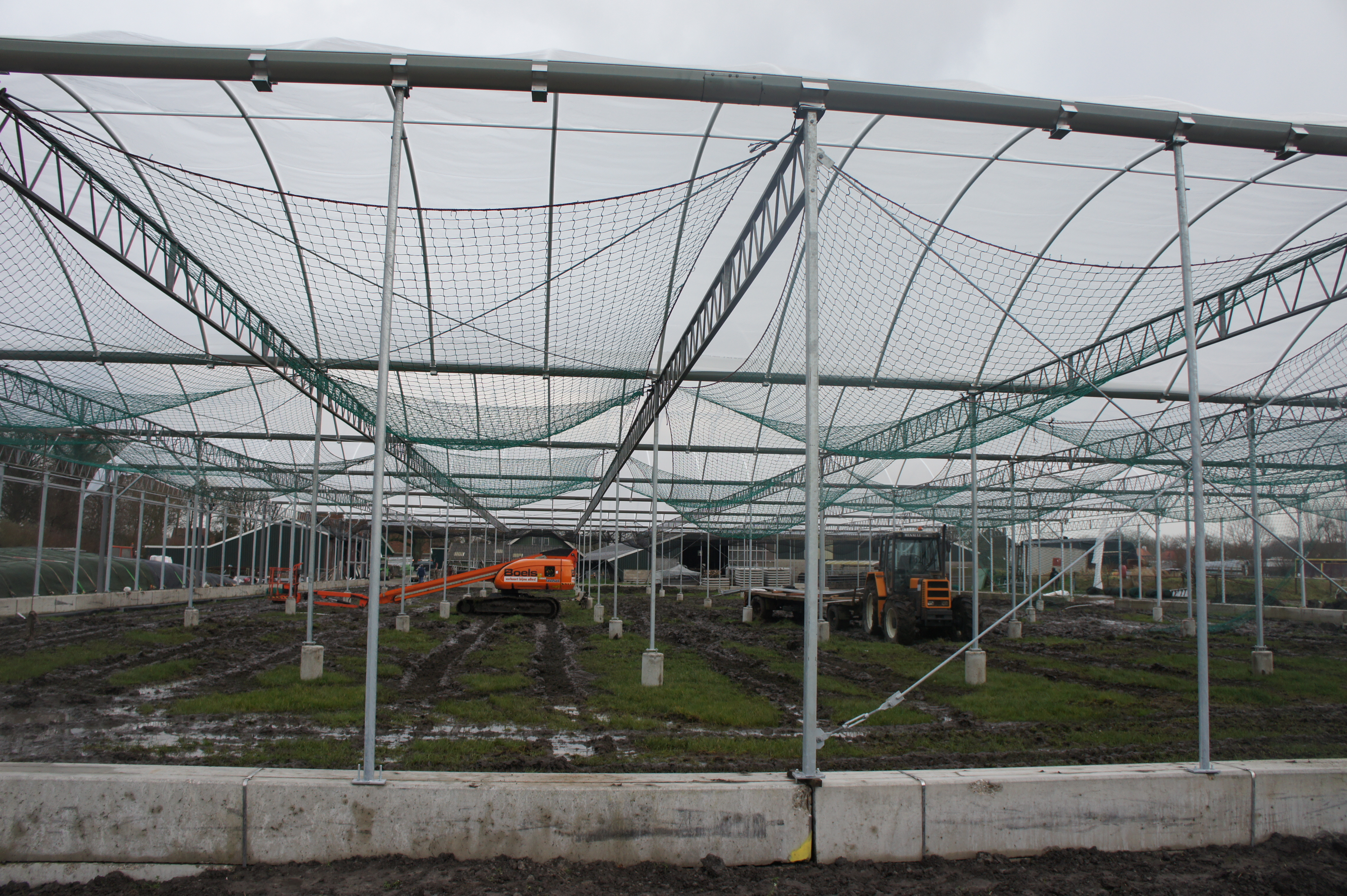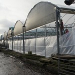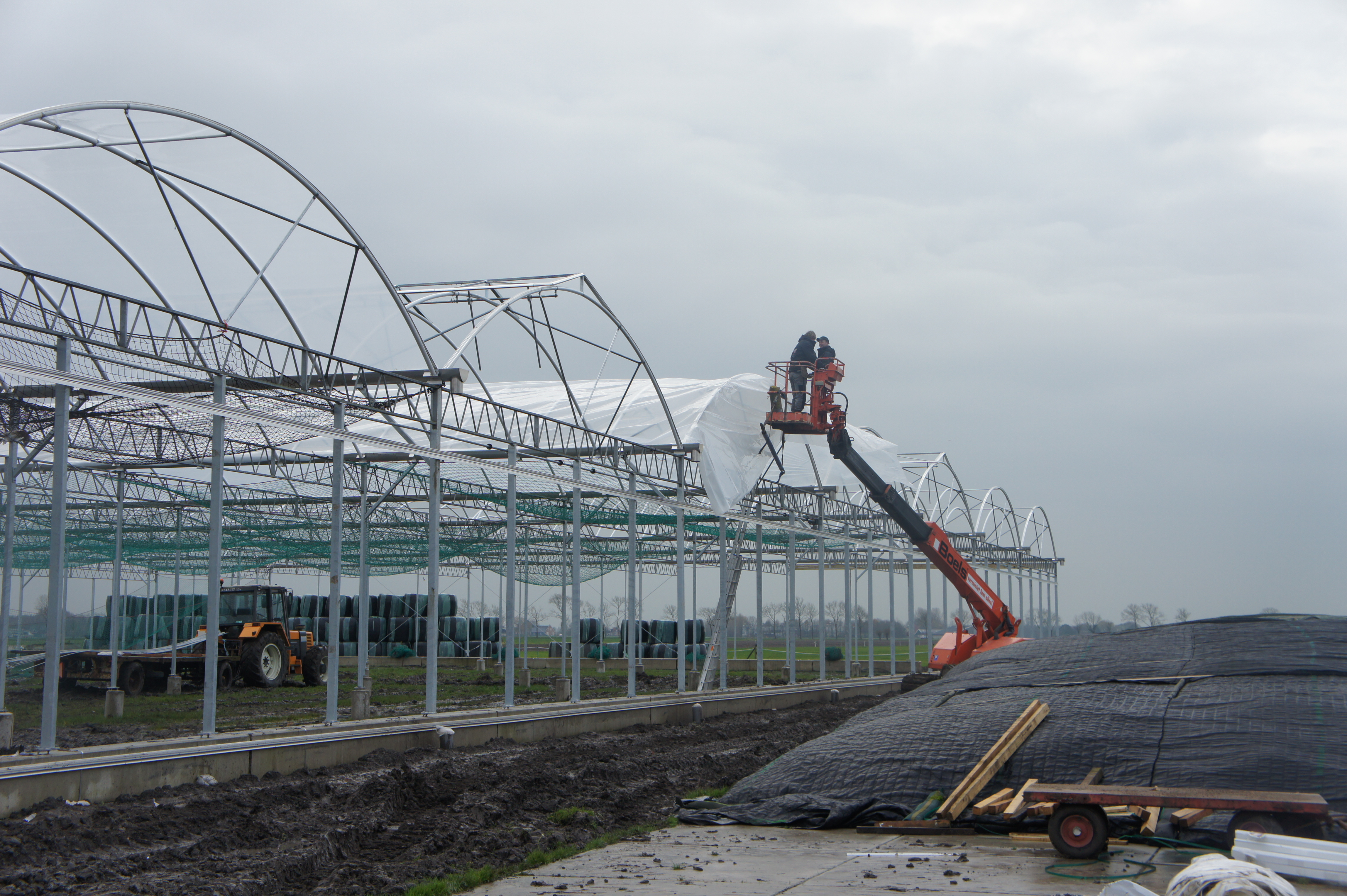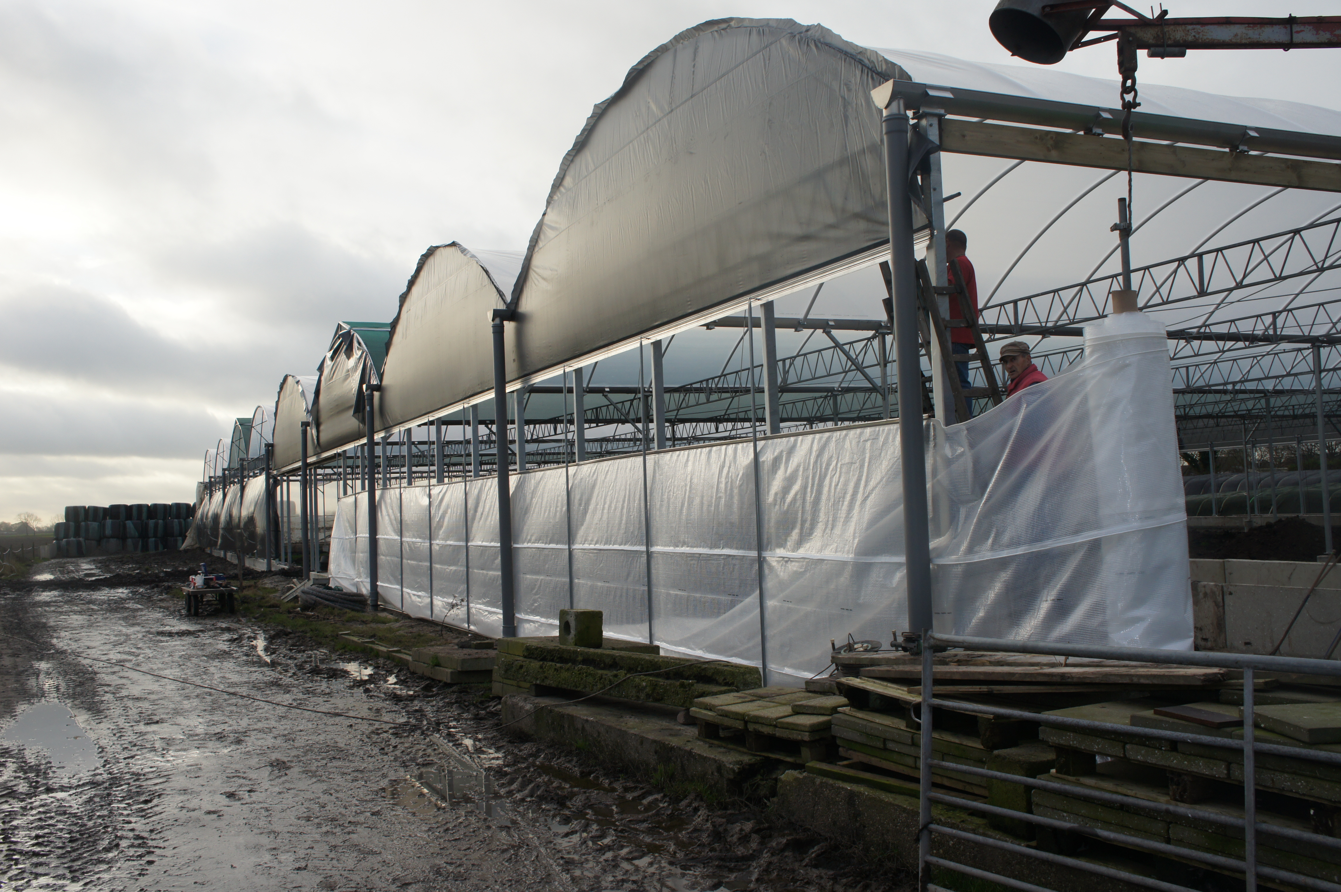 Om de kosten zo laag mogelijk te houden, bouwen we de stal zelf. De foto’s geven u een impressie over de bouwfases. Helaas heeft het weer de afgelopen maanden niet meegezeten; eerst vele mm regen, waardoor onze terrein op de plek van de stal een grote modderpoel leek. Door de kou en de wind kon het folie niet strak genoeg gespannen worden en de storm eind januari zorgde voor veel stormschade aan onze stal in opbouw. Ondanks de tegenslagen vordert de bouw gestaag.