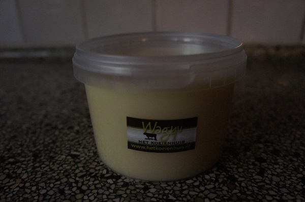 Vanaf heden hebben we een nieuw artikel in ons assortiment; Wagyu-ossewit. Dit is niervet afkomstig van de Wagyu-runderen, het is gesmolten en gefilterd, heeft geen toevoegingen en heeft de heerlijke Wagyu-smaak. Dit vet is uitermate geschikt om (Wagyu)vlees in de bakken en om in te frituren.