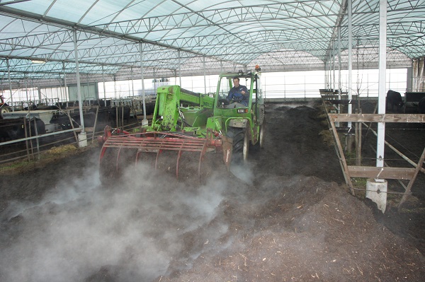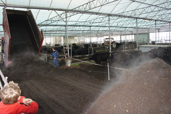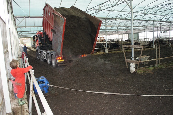 De afgelopen dagen zijn we druk bezig geweest met een nieuwe compostlaag voor de Wagyu-koeien. Door de vochtige tijd buiten, had de oude compostlaag niet voldoende tijd om te drogen. We hebben besloten 25 kiepwagens vol nieuwe compost/hout snippers over de oude laag te rijden.